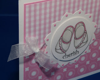 These cute baby shoes are coloured with Promarkers and layered onto free papers from Papercraft Essentials.
